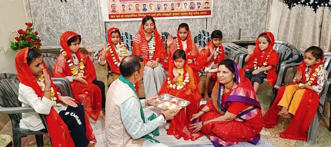 घर पर कन्या पूजन करते एक परिवार के लोग। स्रोत संस्था