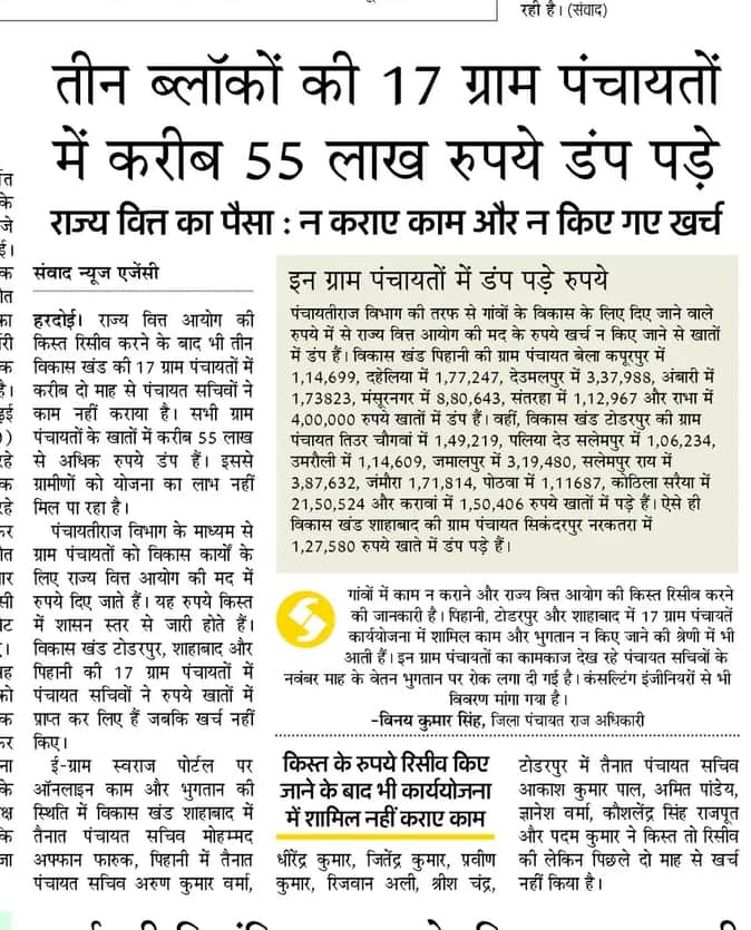 सात विकास खंडों की 34 ग्राम पंचायतों में दो माह से काम न होने और भुगतान न होने से करीब 80 लाख से अधिक रुपये ग्राम पंचायतों के खातों में डंप हैं। इससे जुड़ी खबर को अमर उजाला ने 25 नवंबर के अंक में ‘तीन विकास ब्लॉकों की 17 ग्राम पंचायतों में करीब 55 लाख रुपये डंप पड़े’ शीर्षक से प्रमुखता से प्रकाशित किया था। खबर का जिला पंचायत राज अधिकारी ने संज्ञान लिया है।