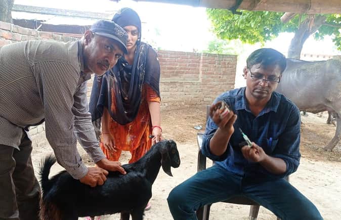 फोटो-27- उजागरपुरवा में बकरी का वैक्सिनेशन करते पशु चिकित्साधिकारी डॉ आरके गौतम