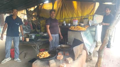 फोटो 23 : टड़ियावां में मिट्टी की भट्ठी पर लकड़ी से समोसा व मिर्चा बनाते दुकानदार प्रमोद। संवाद