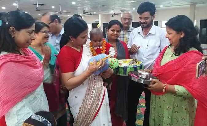 फोटो-41-छह माह के बच्चे का अन्नप्राशन करातीं एडीएम वंदना त्रिवेदी व अन्य
