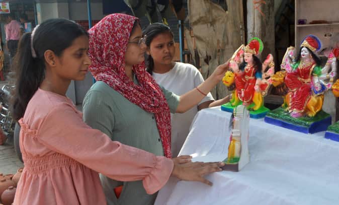 फोटो-05- नवरात्रि की तैयारियों को लेकर मूर्तियां खरीदतीं महिलाएं। संवाद
