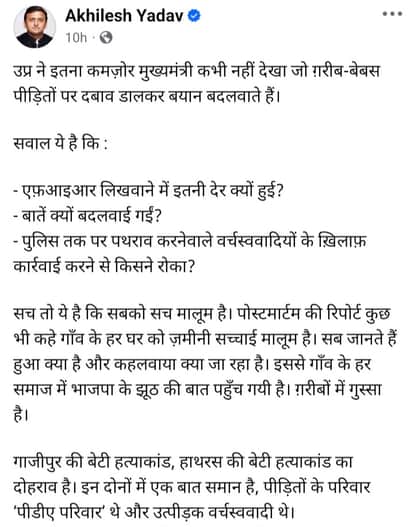 सपा प्रमुख अखिलेश यादव ने रविवार की दोपहर अपने फेसबुक एकाउंट से गाजीपुर की घटना को लेकर पोस्ट किया। उन्होंने बयान बदलवाने पर सवाल खड़े किए। साथ ही लिखा कि गाजीपुर की बेटी का हत्याकांड, हाथरस की बेटी के हत्याकांड का दोहराव है। सपा प्रमुख का इशारा छह साल पहले हुए चंदपा कांड की तरफ है, जो कि राजनीति के कारण काफी सुर्खियों में रहा था।