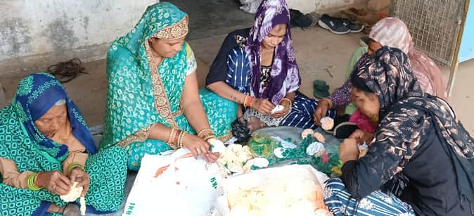 गांव गारवगढ़ी में कृत्रिम फूलों की झालर बनातीं महिलाएं। संवाद