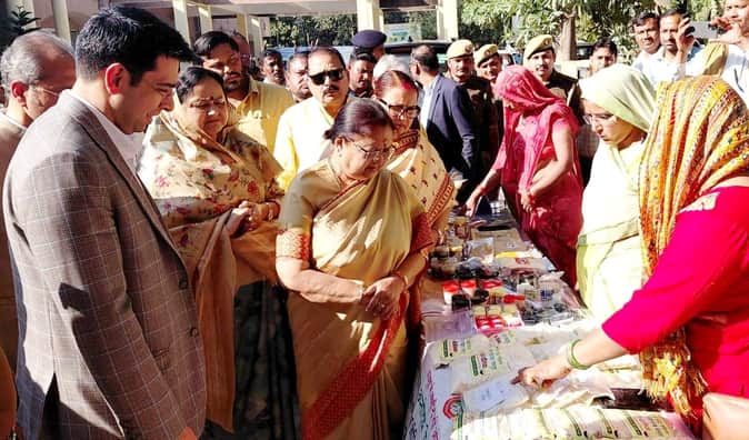 कलेक्ट्रेट परिसर में स्वयं सहायता समूहों द्वारा लगाए गए स्टाॅल का निरीक्षण करतीं प्रभारी मंंत्र