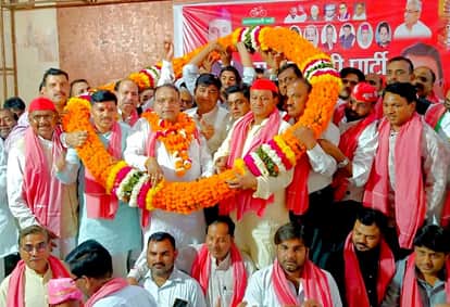 सपा की बैठक में शामिल कार्यकर्ता और पदाधिकारी। संवाद