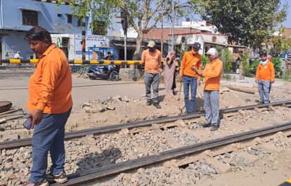 रेलवे ट्रैक पर मरम्मत कार्य करते कर्मी। संवाद