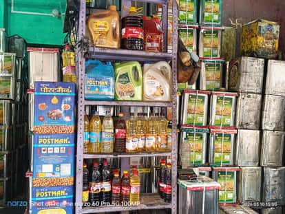 दुकान में रखे रिफाइंड एवं पॉम आयल के टिन एवं बोतलें। संवाद