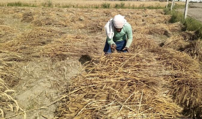 बारिश में भीगी गेहूं की कटी फसल को सुखाता मजदूर। संवाद