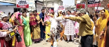 Hathras News: महिलाओं ने पदयात्रा निकाल जताया आक्रोश, विपक्षी दलों का पुतला फूंका