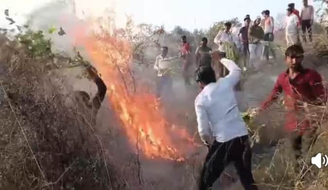 फोटो - 24 जंगल में लगी आग को बुझाते लोग। ग्रामीण