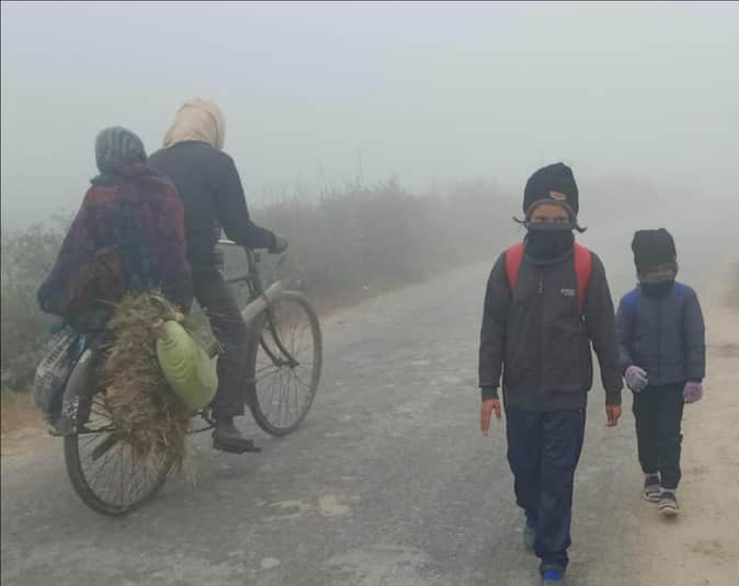 सुबह कोहरे के बीच स्कूल जाते बच्चे। संवाद