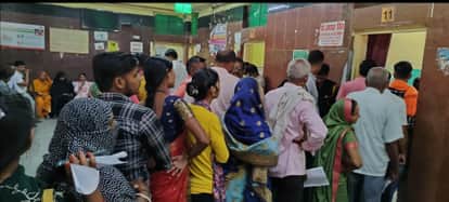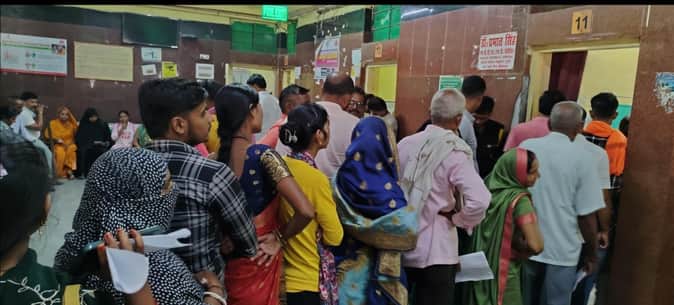 जिला अस्पताल में डॉक्टर को दिखाने को कतार में खड़े मरीज।