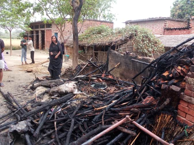 खुटहन के शेख अरखपुर गांव के लखनापारा मजरा बिजली से लगी आग से जलकर राख हुई छप्पर। संवाद