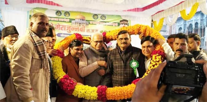 जश्ने मेराजुन्नबी जौनपुर में सपा सांसद बाबू सिंह कुशवाहा का स्वागत करते लोग। संवाद