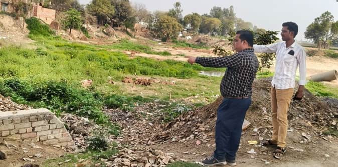 फोटो09कासगंज में मॉडल तालाब बनाने के लिए तालाब का निरीक्षण करते स्वच्छ भारत मिशन ग्रामीण ज