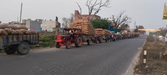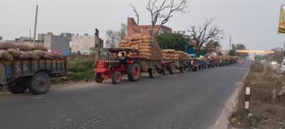 फोटो 23 कासगंज में एक कोल्ड के बाहर खडे आलू लदे वाहन। स्रोत: संवाद