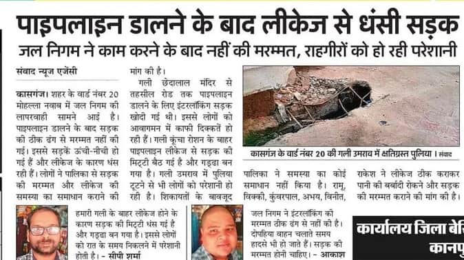वार्ड नंबर 20 के मोहल्ला नवाब गली कूंचा रोशन में जल निगम ने 2 मार्च को नई पाइपलाइन डाली थी। इसका उद्देश्य लोगों को निरंतर शुद्ध पेयजल की आपूर्ति सुनिश्चित करना था। मगर एक माह के भीतर ही पाइपलाइन कई स्थानों से लीक होने लगी। इससे घरों में पानी का दबाव कम हो गया और कभी-कभी गंदा पानी भी पहुंचने लगा। लोगों को इन समस्याओं से जूझना पड़ रहा था और जल की बर्बादी भी हो रही थी। पाइपलाइन में लीकेज के कारण आसपास की सड़क भी धंस गई थी। अमर उजाला ने 26 मार्च को '''' पाइपलाइन डालने के बाद लीकेज, धंसी सड़क'''' शीर्षक से यह समस्या प्रकाशित की थी। उच्च अधिकारियों ने इस खबर का संज्ञान लिया। 2 अप्रैल को पालिका की टीम मौके पर पहुंची। उन्होंने वार्ड में लीकेज सही करने का कार्य शुरू किया।