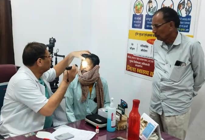 फोटो 01़ कासगंज जिला अस्पताल में चिकित्सक नेत्ररोगी का परीक्षण करते। स्रोत: संवाद