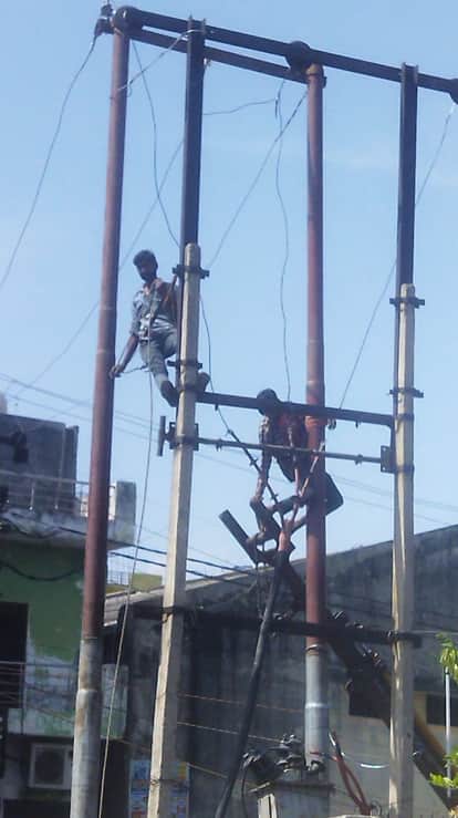 फोटो45कासगंज में डबल पोल लगाने का कार्य करते कर्मी।स्रोत:विभाग