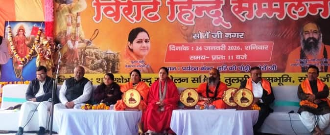 सोरोंजी। राष्ट्रीय स्वयंसेवक संघ के 100 वर्ष पूरे होने पर तीर्थनगरी पर्यटन केंद्र में विराट हिंदू सम्मेलन का आयोजन किया गया। कार्यक्रम में नारी सशक्तिकरण प्रदर्शनी और महापुरुषों की चित्र प्रदर्शनी का भी आयोजन किया गया। सम्मेलन का शुभारंभ अलीगढ़ से आए महामंडलेश्वर पूर्णानंद पुरी और महिला आयोग की सदस्य रेनू गौड़ ने किया।