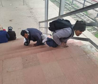 फोटो15कासगंज जंक्शन पर ट्रेन में सवार होने के लिए फुटओवर ब्रिज से होकर जाते दिव्यांग यात्री।