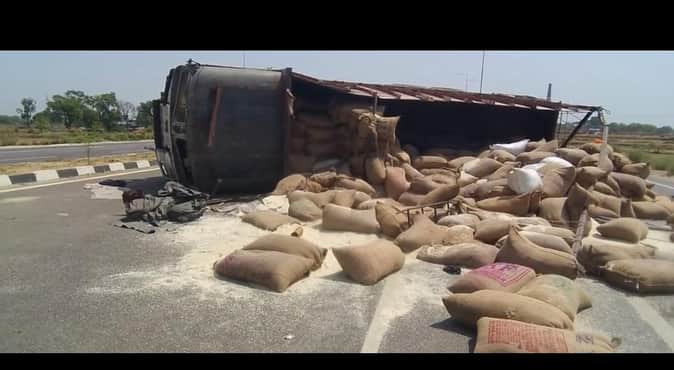 Kaushambi News: हाईवे पर पत्थर से टकराकर अनाज लदा ट्रक पलटा, दो घायल
