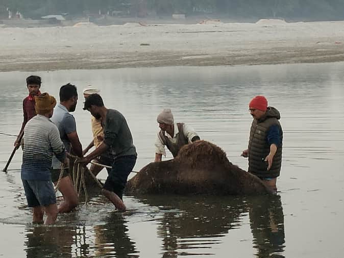 कडा में गंगा जी की दूसरी धारा में फंसे ऊंट को निकलते लोग