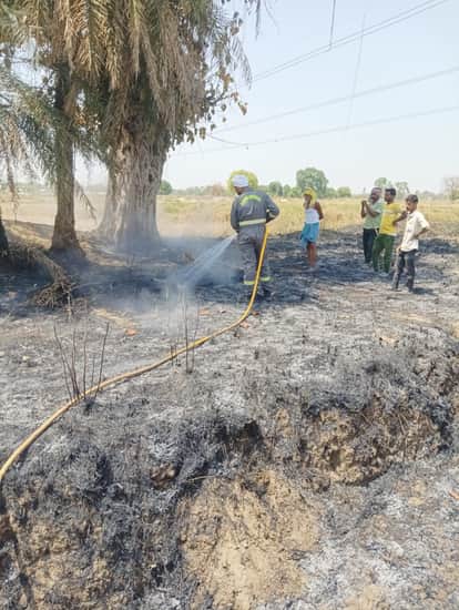 पराली में लगी आग को बुझाते दमकल कर्मी। संवाद