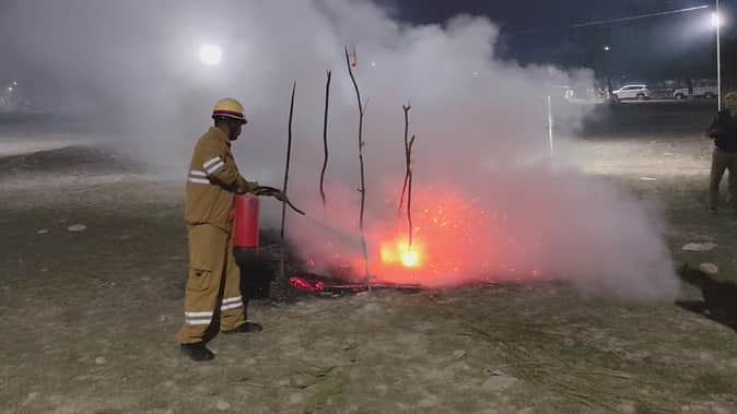 पुलिस लाइन में मॉकड्रिल के दौरान आग बुझाते पुलिस कर्मी- प्रशासन