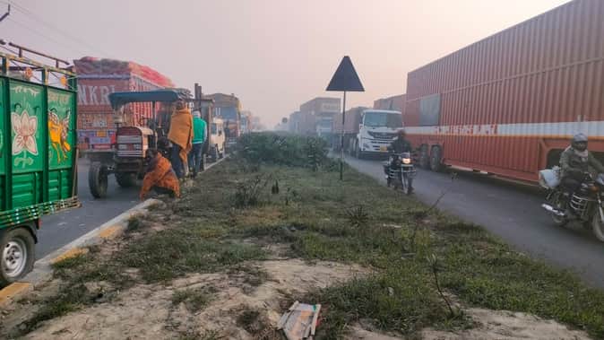 Kushinagar News: हाईवे पर मक्का लदा ट्रेलर पलटा, पांच घंटे जाम रही एक लेन सड़क