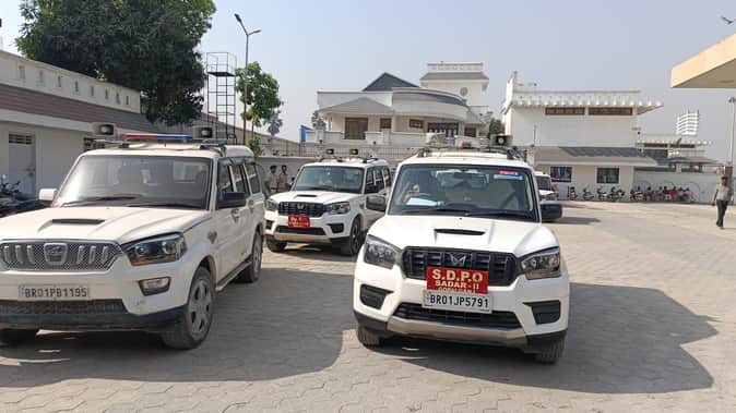 कुशीनगर : बिहार के हथुआ में खड़ीं पुलिस की गाड़ियां। स्रोत-सोशल मीडिया