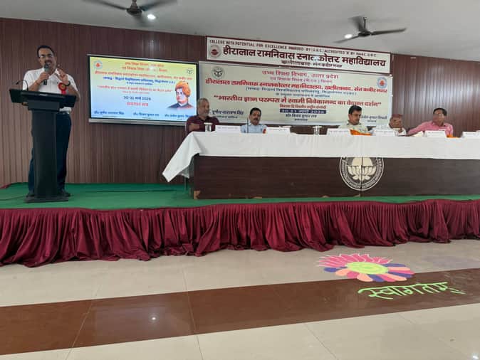 संतकबीरनगर। एचआरपीजी कॉलेज खलीलाबाद के सभागार में उच्च शिक्षा विभाग, बीएड विभाग के तत्वावधान में भारतीय ज्ञान परंपरा में स्वामी विवेकानंद का वेदांत दर्शन, विषय पर दो दिवसीय राष्ट्रीय संगोष्ठी हुई। इसके समापन पर मुख्य अतिथि राम सहाय पीजी काॅलेज रुद्रपुर देवरिया के प्राचार्य प्रो. ब्रजेश कुमार पांडेय ने कहा कि स्वामी विवेकानंद का वेदांत दर्शन न केवल भारतीयों के लिए, अपितु संपूर्ण विश्व के लिए ऐसा प्रकाश पुंज है जो भटके हुए युवाओं को सदियों तक मार्ग दिखाता रहेगा।