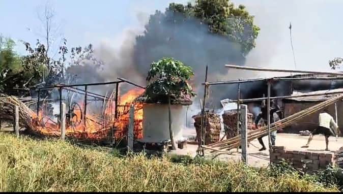 कटाई भरपुरवा गांव के दुसाधी पट्टी में आग लगने से जलती झोपड़ियां।स्रोत-सोशल मीडिया