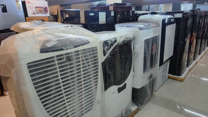 बाजार में शोरूम पर रखे कूलर, फ्रिज आदि। संवाद