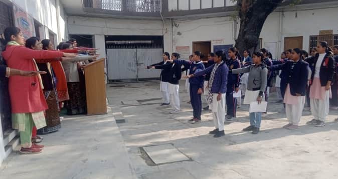 आर्य डिग्री कॉलेज में मतदाता दिवस पर शपथ लेती छात्राएं व शिक्षिकाएं। स्रोत: कॉलेज
