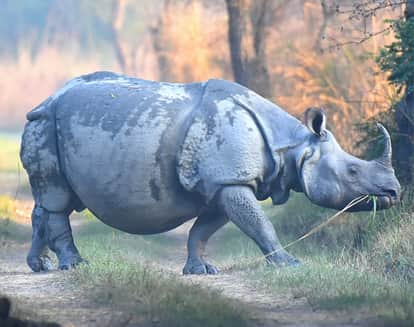 दुधवा पार्क की पुनर्वासन योजना में विचरण करता गैंडा। स्रोत : वन विभाग।