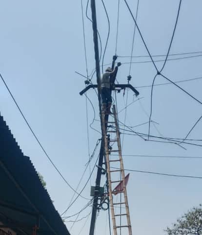 जर्जर लाइन को बदलने के लिए खंभे पर चढ़े कर्मचारी। संवाद