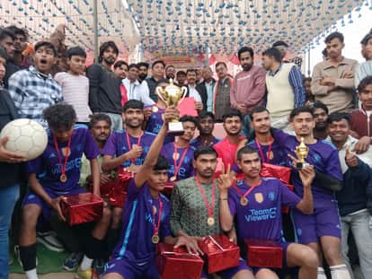 फुटबाल प्रतियोगिता में विजेता टीम ट्राफी के साथ।
