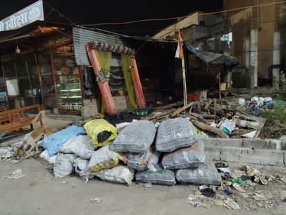 एक दुकान पर रखा गया कोयला।