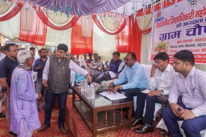 बड़हरा में ग्राम चौपाल में लोगों की समस्या सुनते जिलाधिकारी संतोष कुमार शर्मा।