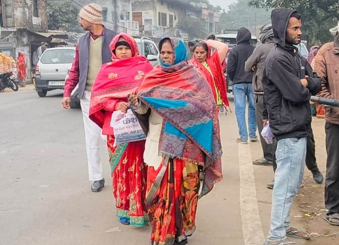 ठंड से बचने के लिए गर्म कपड़े पहनकर जातीं महिलाएं।