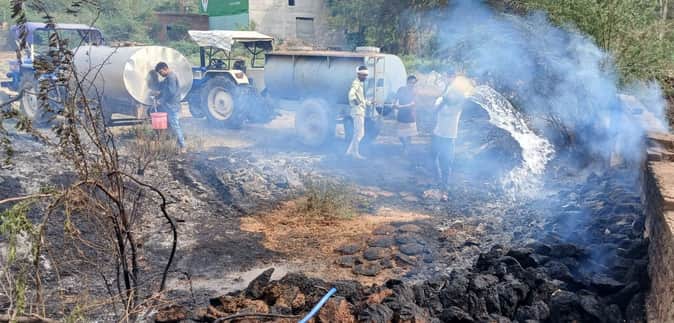 फोटो 27 एमएएचपी 20 परिचय-भूसा, लकड़ी में लगी आग बुझाने का प्रयास करते ग्रामीण। संवाद