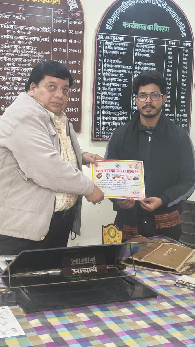 जनपद आगरा के जेपी सभागार खंदारी कैंपस में 17 दिसंबर को मंडलीय युवा उत्सव और साइंस मेला का आयोजन हुआ। शहर के श्री चित्रगुप्त स्नातकोत्तर महाविद्यालय के छात्र आर्यन देव ने मंडलीय प्रतियोगिता में भाषण के लिए प्रतिभा करते हुए मंडल में प्रथम स्थान प्राप्त किया है। उनका चयन राज्य स्तर के लिए किया गया है। आर्यन देव शहर के रामलीला मैदान निवासी संजीव कुमार के पुत्र हैं। संजीव कुमार डाइट भोगांव में कनिष्ठ लिपिक के रूप में कार्यरत हैं। आर्यन की मां आरती देवी गृहणी हैं। जनपद लौटने पर शुक्रवार को श्री चित्रगुप्त डिग्री कॉलेज में आर्यन देव का प्राचार्य डॉ़ मनोज कुदेशिया ने सम्मान किया।