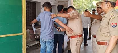 फोटो 44 परीक्षा केंद्र में प्रवेश से पहले परीक्षार्थी की तलाशी लेते पुलिसकर्मी। संवाद