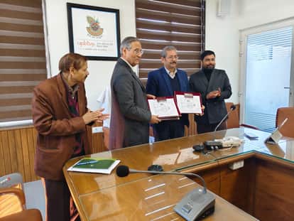 डॉ. ऐश्वर्या महाजन के साथ खड़े उपाध्यक्ष शैलजाकांत मिश्र और सीईओ सूरज पटेल।