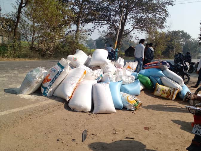 मधुबन के चौथी मिल के पास अनियंत्रित होकर पिकअप पलटने के बाद बिखरा सामान।संवाद