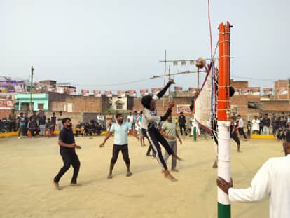 करहां में आयोजित राज्य स्तरीय वॉलीबॉल टूर्नामेंट में अंक के लिए जूझते खिलाड़ी