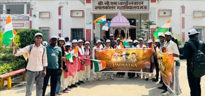 नगर के डीसीएसके पीजी कालेज से मेरा युवा भारत केंद्र के तहत शहीद दिवस पर पदयात्रा निकालते छात्र-
