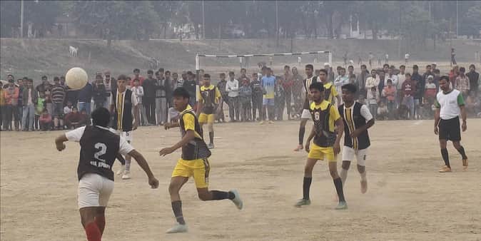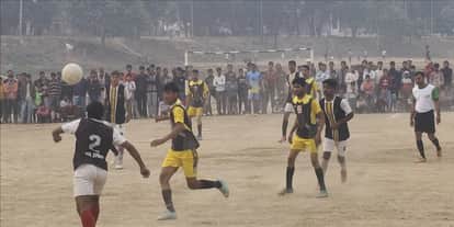 नगर के औरंगाबाद मैदान पर पंडित गोपीनाथ मेमोरियल फुटबाल प्रतियोगिता में खेलते खिलाड़ी।संवाद